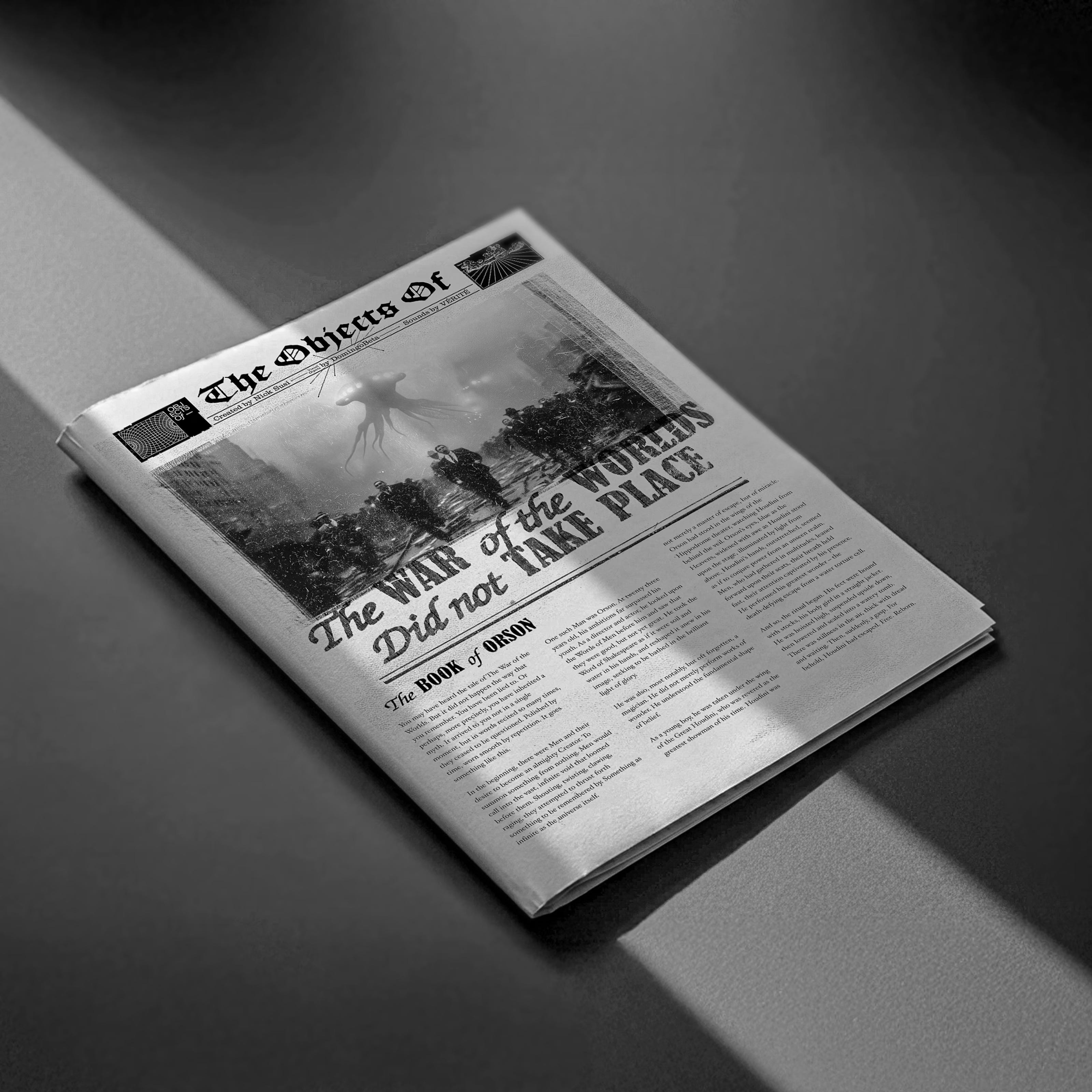 The War of the Worlds Did Not Take Place is an original piece by Nick Susi and Domingo Beta, with a score by VÉRITÉ that was performed live at FWB Fest in the deserts of California last weekend. The piece reworks the famous 1938 Orson Welles-invoked radio panic into a media critique and reflection on today. Available as a digital edition and a 24-page physical tabloid. Love.