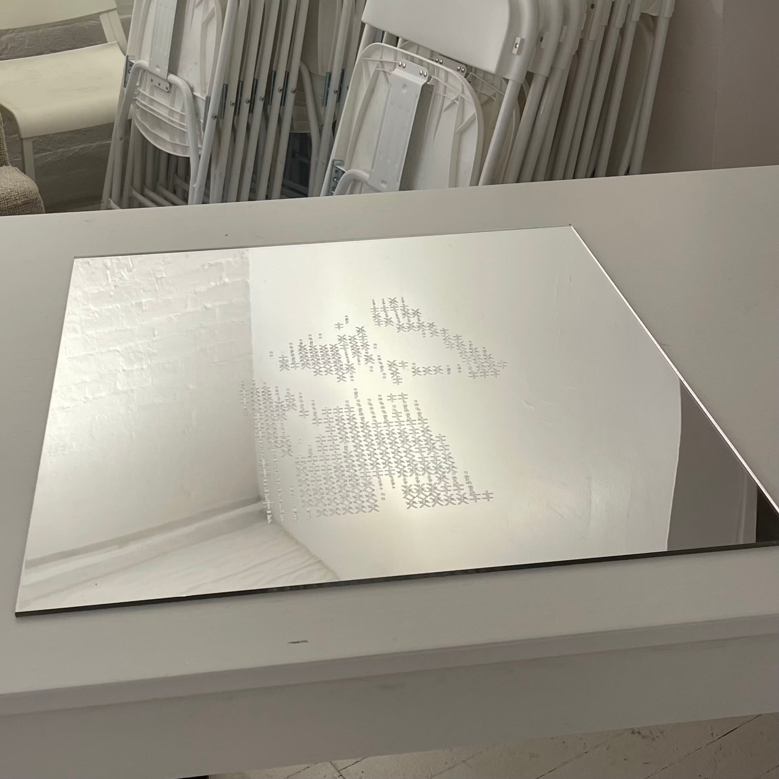 Ruby Bailey’s Crude Encryption renders vulnerability into coded spectacle. Nude selfies become ASCII, laser cut wall pieces, and etched mirror works, turning intimate bodies into puzzles that machines can’t decode. Frosted and metallic surfaces seduce and withdraw, implicating viewers as they gaze. Released as part of the first collection from Synthetics collective, the work exists somewhere between digital trace and physical object.